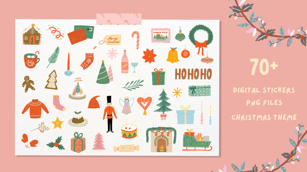 70+ PNG set of Jolly Christmas theme Digital Stickers with high quality for Good Note or other digital planner app!